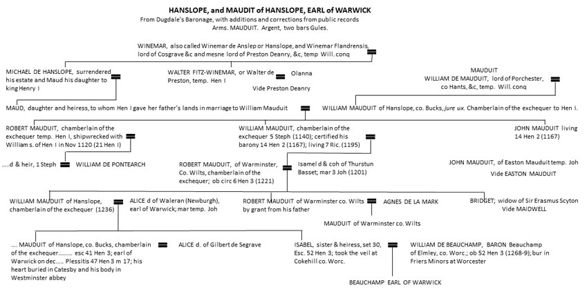 Winemar, beside his portion of Cosgrave, had the whole, or parts of Easton Mauduit, Hanington, Ashton, and Easton Neston; and was also mesne lord of Preston Deanry and Hackleton under the bishop of Constance, of Wotton under Walter Flandrensis, of Rothersthorp under Geoffrey Anselyn, of Knuston under Gunfried de Cinches or Chokes, and of Boscate, Doddington, Brayfield, Houghton, Preston Deanry and Quinton, under the countess Judith. So ignorant were the Norman scribes of the names of the tenants in chief, or so careless of preserving their identity, the Winemar occurs under four different designations: in most of the Northamptonshire entries he has that appellation only, but as claimant of Piddington and Wollaston, against the countess Judith, he appears with the addition of de Anslepe and de Hanslepe, and it is still more singular that under Hanslope he is not described by that local addition, but as Winemar Flandr [Flandrensis], thugh every circumstance combines in proof that the same individual is intended. The site selected for his castle in Hanslope, now called Castlethorp, is bordering on Cosgrave parish, which accounts for his retaining Cosgrave in his demesne. Michael de Hanslope surrendered his inheritance, and Maud his daughter to the disposal of King Henry I, who bestowed them both on William Mauduit his chamberlain; and Henry duke of Normandy, afterwards king Henry II, confirmed to the succeeding William Mauduit the office of chamberlain, and the castle and honor of the castle of Porchester in Hampshire, with all the lands of Michael de Hanslope in as ample a manner as given to his father. This William in 14 Hen II (1167) certified his barony to consist of four fees and a half of the old and new feoffment. William, the last heir male of the elder line of Mauduit, succeeded to the earldom of Warwick on the decease of John de Plessitis, second husband of Margaret Newburgh, Dying without issue in 52 Hen III (1267) Isabel, his sister and heiress, carried the earldom to the Beauchamps; and not only the paramount but the beneficiary interest in Cosgrave, it will be subsequently shewn, became vested in that noble family.