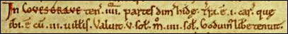 In COSGROVE [the count] holds 4 parts of half a hide. There is land for 1 plough, which [plough] is there, with 3 villans. It was worth 5s ; now 4s.