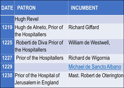 In 1315 Richard de Paveley was Prior of the Hospitallers. By 1361 Sir John de Paveley was Prior. Walter de Paveley held the Manor of Cosgrove for a short time in 1341 and then abdicated it. We can imagine how this family held on to rights and profits unconnected with their duties in respect of the advowson of Cosgrove Church. Recorded Lords of the Manor of Cosgrove during this period