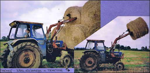 Basil Richards driving his Ford 400 moving round bales with a Quicke 2030 Loader in 1992