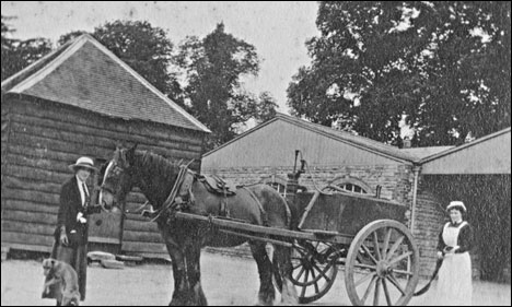 | A typical scene outside Cosgrove Mill, c.1880. Thomas Amos, a farmer and maltster from Castlethorpe. He sent corn to be ground at the mill. Mr Brinson was living in the cottage on the left at the time, and may be the gentleman on the right with his son. |