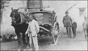 The horse is pulling a water bowser and the maid can be seen holding the end of the water pipe.