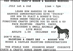 We will be open to the public most weekends and weekdays, so come and meet ‘Prince”; watch a harness demonstration and see him in full Boat Harness. We have horse drawn vehicles on display, including the Cosgrove Recycling vehicle, along with our ongoing restoration work. We have informative displays and guided tours are by appointment. The Stable Yard is a Visitor Centre for scouts, guides and youth groups, and walkers may find it an interesting resting point to eat their packed lunch during their canal side-walks. Our visitors will be able to gain a rare insight into the workings of a contemporary horse drawn vehicle business.