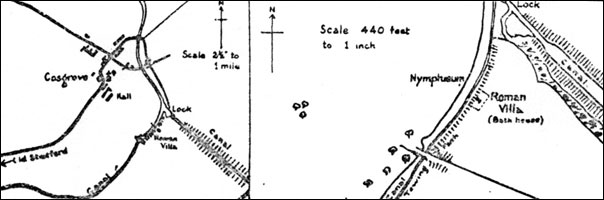 V.C.H. Northants records Roman coin finds at two points not exactly placed, and for some time our Society has closely watched soil disturbance. On the turnover of grass-land to plough in August 1957, R. Harris was requested to look over the ground from which he brought in pottery. Further examination with assistance of a probe proved masonry only a few inches below the surface near to the canal embankment. The field gave little away; it has apparently been enclosed park and meadow-land for centuries, protecting it from medieval ploughing which certainly would have exposed it.