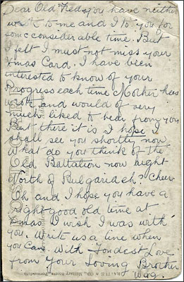 What do you think of the Old Battalion now right North of Bulgaria eh? Cheers.Oh and I hope you have a Right good old time at Xmas. I wish I was with you. Write us a line when you can.