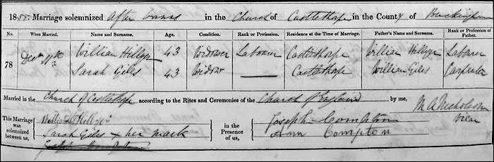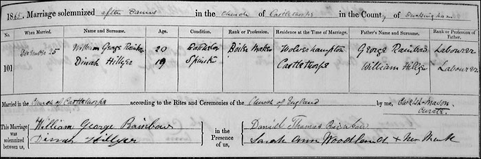 On Christmas Day 1865 he married 19 year old Dinah Hillyer (daughter of William Hillyer) in Castlethorpe church. Emma and Mary Ann were born in Wolverhampton, subsequent children were christened in Castlethorpe. The family ended up in West Ham, East London where William George became a master boiler maker.