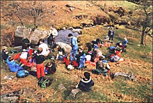 Reaching the top we rested in warm sunshine to view spectacular scenery. We continued but experience very high winds which resulted in the party having to join hands to retreat the way we had come. On our return Lee Payne found a sheep’s skull near a stream and Baloo said he would take it home and boil it. The party looked surprised surely Mrs. Brown feeds him well enough without him having to resort to making sheep’s head soup but he went on to explain that Mr. Trodd could mount this find as a memento of the Trip.