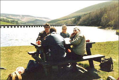 The Cub Scouts energetically took part in a ball game where Oliver and Michael had to stand on top of the picnic tables, the Leaders must have a word to parents concerning table manners. Lunch was taken by the shore line where we experienced strong gusts of wind but as the food had been consumed before this event only cub caps and empty bags were blown across Derbyshire. We then walked to the foot of Derwent Dam and tried to guess the height of the water to the top on the other side before we climbed to the top.