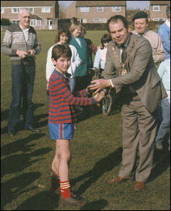 The Mayor presenting William Giffin with the trophy for the best Cub Scout player