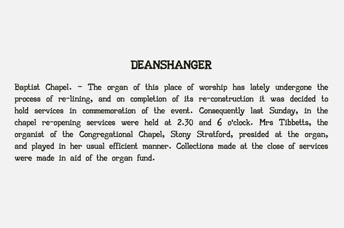 The Baptist Chapel has been much altered over the years having been put to a variety of uses, including a private residence, an Infants School. Much later the building was subsumed by the Oxide Works to become an office which following the closure of the Oxide factory was handed across by Persimmons, the developers, as part of the redevelopment scheme and designated for community use. It is now the Deanshanger Parish Council Office.