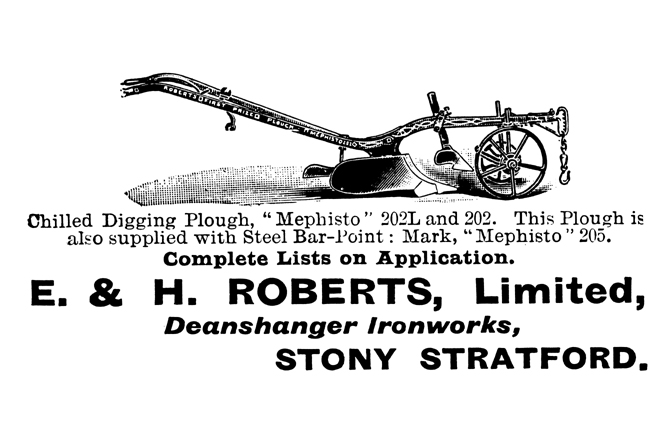 The early horse-drawn and hand ploughs were constructed with a wooden beam and metal fitments. Most of the ploughs were marketed under the ‘Mephisto’ trade name with the option of varying attachments for different soil types and the company made spares readily available as an after sales service. The best known plough was the award winning Mephisto Prize Medal Gang Plough, an image of which was used on the company letterhead with the claim of it having won 3,750 prizes. Examples of the plough were mounted on roofs of their buildings in Deanshanger, Buckingham and Stony Stratford where they also had an office.