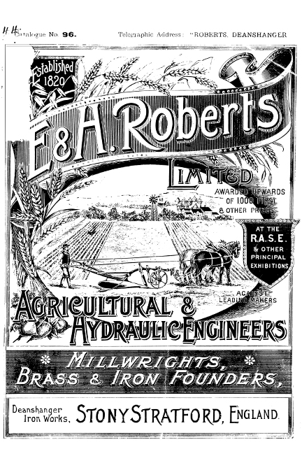 The Company enhanced its reputation when exhibiting products at Agricultural Shows around the country, demonstrating and entering competitions that it often won. At the Altrincham Agricultural Society’s Show in 1910, E & H Roberts displayed 69 ploughs and sold over 150. The business also had a successful, extensive marketing campaign and produced illustrated catalogues that included line drawing engravings of its products. In 1910 the Implement and Machinery Review, a specialist magazine, reported the company was “doing a creditable amount of trade with foreign and colonial buyers” regularly supplying merchants in France and North Africa with ploughs and elevators” and Agents were selling products as far afield as Europe, Argentina, South Africa, India and Australia.