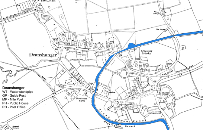 The Cosgrove to Buckingham Arm of The Grand Junction [later renamed Union] Canal was opened on 1st May 1801 and wound its way through the heart of Deanshanger. Two brick and stone humped-back bridges built in High Street and Church Lane crossed the water, and pedestrian wooden lift-bridges were sited on The Hayes, in the field of Dove House Farm that extended behind the Primary School and another one that forded the canal on the outskirts of the village towards Old Stratford. The wooden lift-bridges were operated by hand, pulling on the counter-balanced large wooden beam raised or lowered the wooden-plank footbridge across the water.