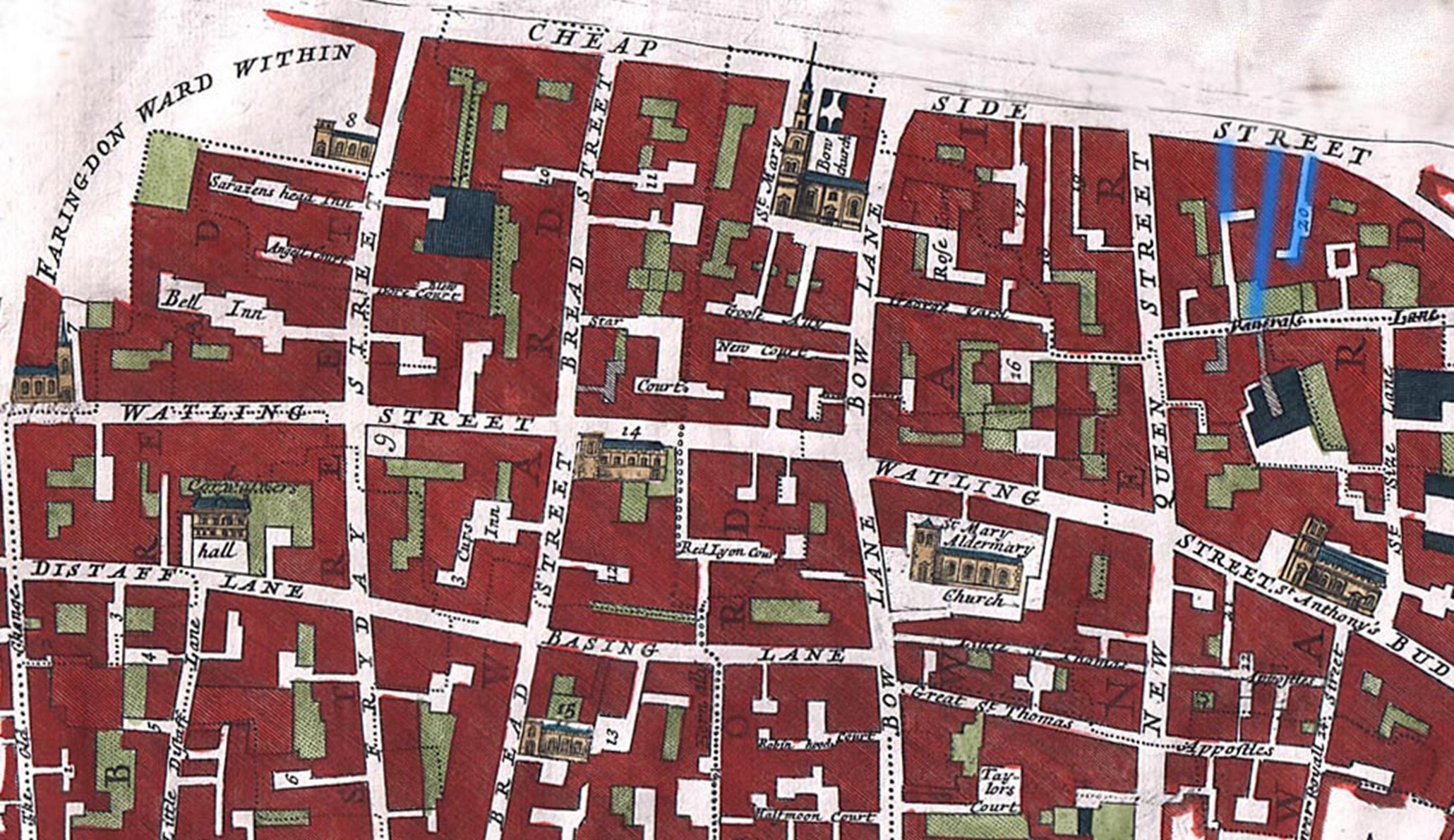 Bread street ward and Cordwainer ward shown on the map of 1720 by John Stow, Public domain, via Wikimedia Commons