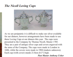 Thomas became the Master of The Worshipful Company of Upholders and donated two silver loving cups to them.