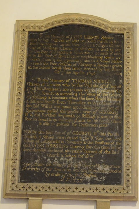 The image to the left is the Memorial Plaque in the chancel of the present Abthorpe Parish Church remembering Jane Lesson and Thomas Nichol who bequeathed to the poor of the village and the then ancient church of the village.