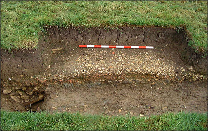 The garden path is almost 3 metres in width, cambered, and shows a three layered construction with a clay base, rammed roof tile hard-core and gravel top surface. Under the western edge a stone lined ‘V’ shaped drain was revealed. Pottery finds date the path construction to the late 16th century.