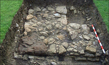 In June 2001 the back lawn of the author’s home was dug revealing part of the manor house wall. The construction is of coarse limestone blocks on either face backfilled with smaller stones the whole being almost 1 metre thick. 11 walls were built upon a stepped foundation course in turn placed in a 2 metre wide construction trench. During the excavation of the accessible wall two chimney breasts were exposed, one with a largely intact flagstone fireplace complete with one of the iron fastenings for the firedog.