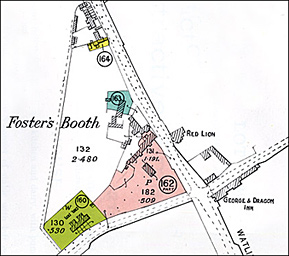Within the parish of Cold Higham can also be found that part of Foster's Booth situated on the west side of Watling Street. Foster's Booth (previously called Forster's Booth) is a small hamlet formerly lying partly in Cold Higham and partly in Pattishall, and now counted entirely to the latter. It began life - so Bridges describes it - as "the hut or booth of one Forster, a poor countryman", who seems to have decided to make a living out of providing refreshment to travellers on Watling Street. No date for this is given, but a number of houses are shown on the Survey Map of 1727 (see below). Note that the map would not have shown area the Duke did not own, so nothing appears on the east side of Watling Street. By 1791, others had copied Forster's example and according to Bridges the one booth "grew little by little to a fair street of inns. The houses are built each side the Watling Street, which passeth thro' the middle of it. The Earl of Pontefract keeps here his hundred-court". The Cold Higham rentals of 1740-50 list two people leasing an inn each at Foster's Booth, and the tenancies and changes can be tracked through the Estate Rentals up to 1875, though only The Crown seems to have survived as an inn. No mention of it appears in the Estate Sale of 1919. The longer-lived premises at Foster's Booth shown below on the sale map for Cold Higham were neither of them owned by the Duke.