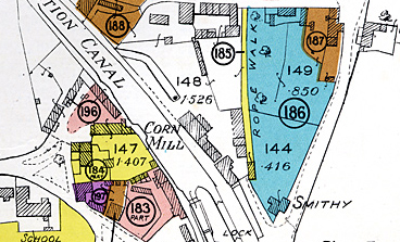 | Detail from the Grafton Estate Sale Map of 1919 for Stoke Bruerne. The Rope Walk is labelled and marked as the narrow strip of land in yellow, numbered Lot 185.