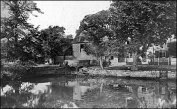 The author mentions that his grandparents' farm was called "Cuddington Mills" - suggesting that there two mills, which from the text seem to be a watermill as well as a windmill. This is Cuddington Mill pond and sluice about 1910 - the same period the author was there. The Mill house can only just be glimpsed through the trees.