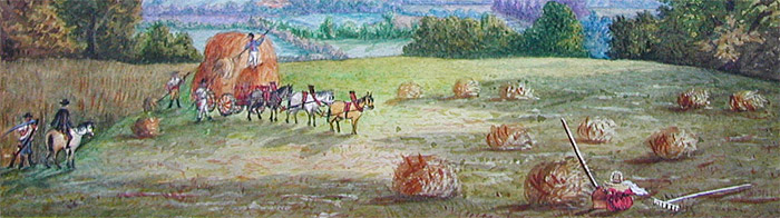 Before haymaking machines were introduced, grass for hay was cut with scythes.  I can well remember half a dozen men moving five feet swathes following each other across a field.  It was very hard work and the grass needed to be long and the scythes very sharp.  The men consumed oceans of beer with no ill effects.  Should anyone’s poultry or pets found straying into the long grass making it difficult to mow, the men if finding the owners would demand a quantity of beer.  The grass was then turned with wooden rakes after being dried one side, if a heavy crop it would be shaken up with two-tined hay forks.  Assuming the weather is dry and going to be fine, a horse-rake would put it into rows so as to allow a wagon to pass between.  Two men would be on either side to pitch it up to a loader on the wagon.  There was a special way of putting it onto the load to bind it in so it would not shake off when moving.  If it had to travel far when complete, a rope would make it secure.