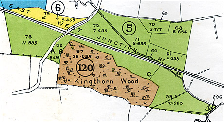 The well known Fox Cover, Kingthorn Wood. A Wood of well-grown Oak of good quality averaging upwards of 20 cubic feet. It extends to an area of 26 acres, and adjoins the Greens Norton and Bradden Road, 3 miles from Towcester Station, and is in hand.