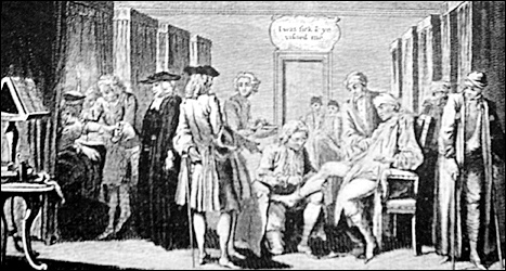 Four beds on each side draped with heavy hangings, which would not at all conform to modern ideas. The Physician, wearing the dress of the period, with periwig and three-cornered hat, his gold-headed cane suspended from his left wrist, and a sword by his side. The surgeons are in attendance. One is bleeding a patient and the other bandaging a leg: there is a clerical looking individual, who may be one of the incumbents in the town.