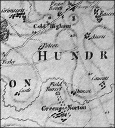 Potcote is one of a number of small settlements in the area (such as Duncote, Grimscote, Field Burcote, Eastcote) with the suffix -cote. There is documentary evidence for it once having been a manor. (Click to read about the Langley Cartulary). The manor of Grimscote (and possibly Potcote) passed from the Langleys to Sir Richard Empson, and from him to the Earls of Pomfret. The Greene family holdings in the area (and possibly the land if not the title of the manor of Potcote) passed to the Parr family - one of whose offspring was Catherine Parr, Henry VIII's last wife - and thus to the Crown. The manor of Potcote is not mentioned as part of the honor of Grafton in 1542, though that of Greens Norton is. The Greenes' former holdings thus became part of Catherine de Braganza's settlement from Charles II and thus passed in time to the Dukes of Grafton. Certainly Baker writes in 1824 that the principal proprietor of Cold Higham was the Duke of Grafton, who had 1120 acres, including Potcote.