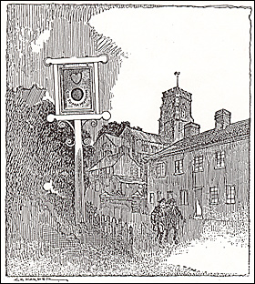 Potterspury, succeeding to Old Stratford, is a kind of brother village, as it were, to Paulerspury, a mile away. Potterspury, really owing its name to an ancient pottery trade in common ware of the kitchen utensil and flower-pot sort, stands partly facing the old coach road and partly down a bye-lane, and is wholly old-world and delightful. One comes into it under the thickly interlacing branches of tall hedgerow elms that conspire to cheer the traveller with a perpetual triumphal arch of welcome. Through this leafy bower one perceives the roadside cottages dwindling away in perspective along a gentle rise. Graceless the village looks awhile, for no church meets the gaze. That, however, is a long distance down the bye-lane, and in the neighbourhood of a little inn with the odd name of the "Blue Ball"," and a still more odd sign pictured in the accompanying sketch. The blue ball, apparently representing the world, is placed below a brown heart, the whole mystical composition semi-circled by the motto "Cor supra mundum" It is representation of the triumph of sentiment that would have caused the Rev. Laurence Sterne to shed tears. "Heart above the world." How idyllic!