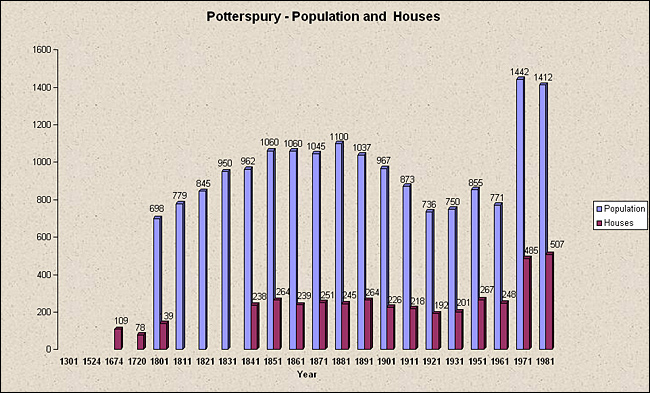 The population and housing statistics for Potterspury show that the village follows the same general trends as most others on the former Grafton Estate: growth in the early part of the 19th century followed by decline and then expansion in the late 20th century. In Potterpury's case the rises and falls were a little gentler - the village even shows an increase in population in 1881 - and the increases in the last decades of the 20th century were more dramtic, with the doubling in housing and population the 1960s.