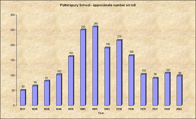 Education in Potterspury can be traced back to at least 1779, when the 3rd Duke of Grafton was paying for the schooling of twelve poor boys from Potterspury and Yardley Gobion. In 1805 the Duke opened a schoolhouse in Potterspury, and this functioned until a National School was opened in the village in 1817. The new school did much to improve behaviour, and there was obviously scope for more pupils if a larger building could be found. The Duke agreed to contribute to this if the Northamptonshire Society would also give a building grant. This went ahead, and by 1820 numbers had risen. They continued to rise for the rest of the century, driven in part by the admission of girls in 1857. Numbers at the Sunday school had been high in the early part of the century but fell later. As at Paulerspury, there were frictions with the non-conformists in the community, who had a flourishing Sunday school but no day school and had been accused in the 1820s of trying to undermine the new school. Nonetheless, the school continued to prosper, an infant department was added, and in 1890 the Duke paid for two new classrooms and the refurbishment of the existing classrooms. The pressure on places and size continued. After a threat from the Inspectorate in 1909 to withhold the grant to the school unless the premises were improved, it was closed for three months in 1910 while the work was carried out.
