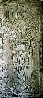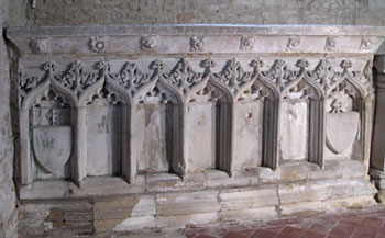 An altar-tomb of freestone, 86 cm high, supporting a slab of alabaster 14cm thick, 2·08 x 0·91 m. In this is deeply incised the figure of an armed man, his head resting on a crested great helm, supported by two angels, his feet against a lion, two small shields on either side of his body, and a marginal inscription in Gothic minuscule. The lines of the incising have been filled with black pitch compound; the shields, and the scroll attached to the crest, must once have been painted, but no trace remain. The entire surface is much defaced with scratches. The slab projects over the side of the tomb chest, with the underside chamfered, on which are relief carvings, alternately square flowers and loins' heads, some with leaves sprouting from their mouths. There are considerable traces of gilding and red colouring on these carvings. The visible side of the tomb chest is divided into seven deep ogival niches, with blank shields hanging from leafy sprigs in the outer two, and the remains of attachments for figures of angels or weepers in the remaining five. A further nine niches, slightly reduced in height, salvaged from the concealed side and ends of the tomb, are positioned as a reredos on the east wall of the chancel.
