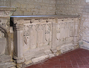An altar-tomb of freestone, 85 cm high, with a smooth cover slab 1·92 x 0·92 m, on which are incised two crosses side by side, the heads consisting of four arms each terminating in a fleur-de lys, linked by four cusps, with smaller fleur-de-lys at the diagonal points, the stems rising from three steps. The slab projects over the side of the tomb chest, with the underside chamfered, on which are relief carvings. Along the surviving side are successively a face, rose, ballflower; ballflower, square leaf, ballflower. The side of the chest is divided into two panels, each with an arcade of four pointed shallow niches; the center two in each panel are blank, the outer two each with a shield hanging from a leafy sprig. No trace of the paint remains on the shields or in the blank niches. Three further blank niches, collected from the concealed side and ends of the tomb, have been set on each end of the reredos in the east wall of the chancel.