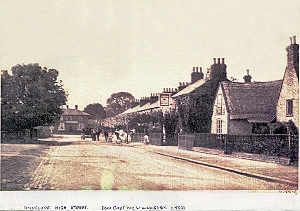 High Street with the old Cock Inn on the right and the Watts Arms at the end of the street. c.1925