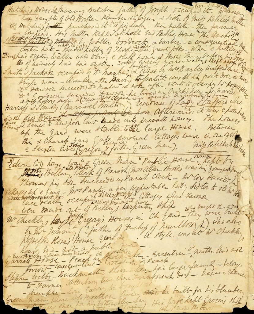 SMITH AND JACKSON – occupied by Dr Mayhew, surgeon, (and owned by Mrs Barbey – Hertfordshire) – single man – drunken – the …. was at his front door and now Dr Dawson succeeded Dr Mayhew and soon after went to occupy Mr Rogers house. Dr Goodwin succeeded Dr Dawson – he lived in Cricks house – he married a Miss Rogers, sister to Thos and Mrs Cleaver who occupied Farnborough (uncertain) Farm. | Mary Smith and Charlotte Jackson, sisters, were living in High Street in 1861, probably on the west side of The Square in Old Cobblers.