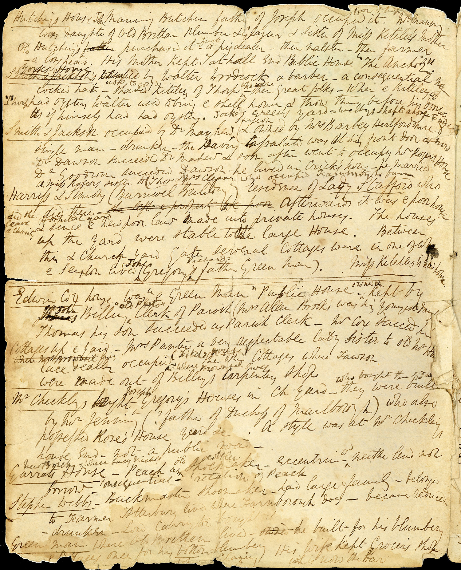 HUTCHINGS HOUSE – John Manning butcher father of Joseph occupied it for shop. Mrs Manning was daughter of old Brittan, plumber and glazier and sister of Miss Kitelee’s mother. Old Hutchings purchased it – first a pig dealer – then maltster – then farmer – a long head. His mother kept Tathall End Public House “THE ANCHOR”. | John Manning married Lucy Brittain in 1778. He is recorded as a butcher in survey of 1798.