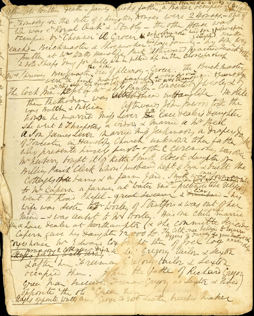 THE COCK INN – Fitche’s shop till Hindes bought it when it was transferred to present place – kept by Mr and Mrs Panter – converted by J. Wesley and by them methodism was established in Hanslope. He still was Butcher and Publican. Afterwards John Inwood took the house he married Miss Lever a lace dealers daughter. She went to Thrapston a widow and married a Mr Beal. A son James Lever married Miss Jenkinson a drapers daughter of Towcester, in Hanslope Church unknown to her father who presented himself just after the ceremony was over. Mr Newberry bought it of Kitty Smith eldest daughter of Billing Parish Clerk, whose husband kept the inn and built the cottages once barns and a farm yard. Smith was once a forman to Mr Capern a farmer at Water End – (Lincoln Lodge below Cuckhold hill) – pretended to be religious – went to Road Chapel – great swearer and drunkard – liar – his wife was sister to Mr Worley of Stratford and was out of her mind – and was aunt to Mr Worley. Had one child who married Hillier a lace dealer at Northampton and she committed suicide. Capern gave his daughter 12000 £ – The Cock once belonged to Esquire Higgins of Turvey he gave methodists H Newbery shop | See page 1 for Fitch’s shop which was probably at No.16 High Street which this suggests was the site of the Cock Inn until it transferred sometime before 1779 when a survey shows it on the present site. John Panter took over the licence for the Cock in 1785 when he married Elizabeth Inwood who held the licence from 1768. He died in 1792, and in his will he is recorded as a butcher.