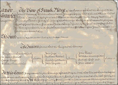 At the View of Frankpledge tenants of a Manor were held responsible for the actions of others within a grouping of ten households. They were therefore responsible to see that other tenants and inhabitants who were charged with a crime appeared in the Court to answer the charge.