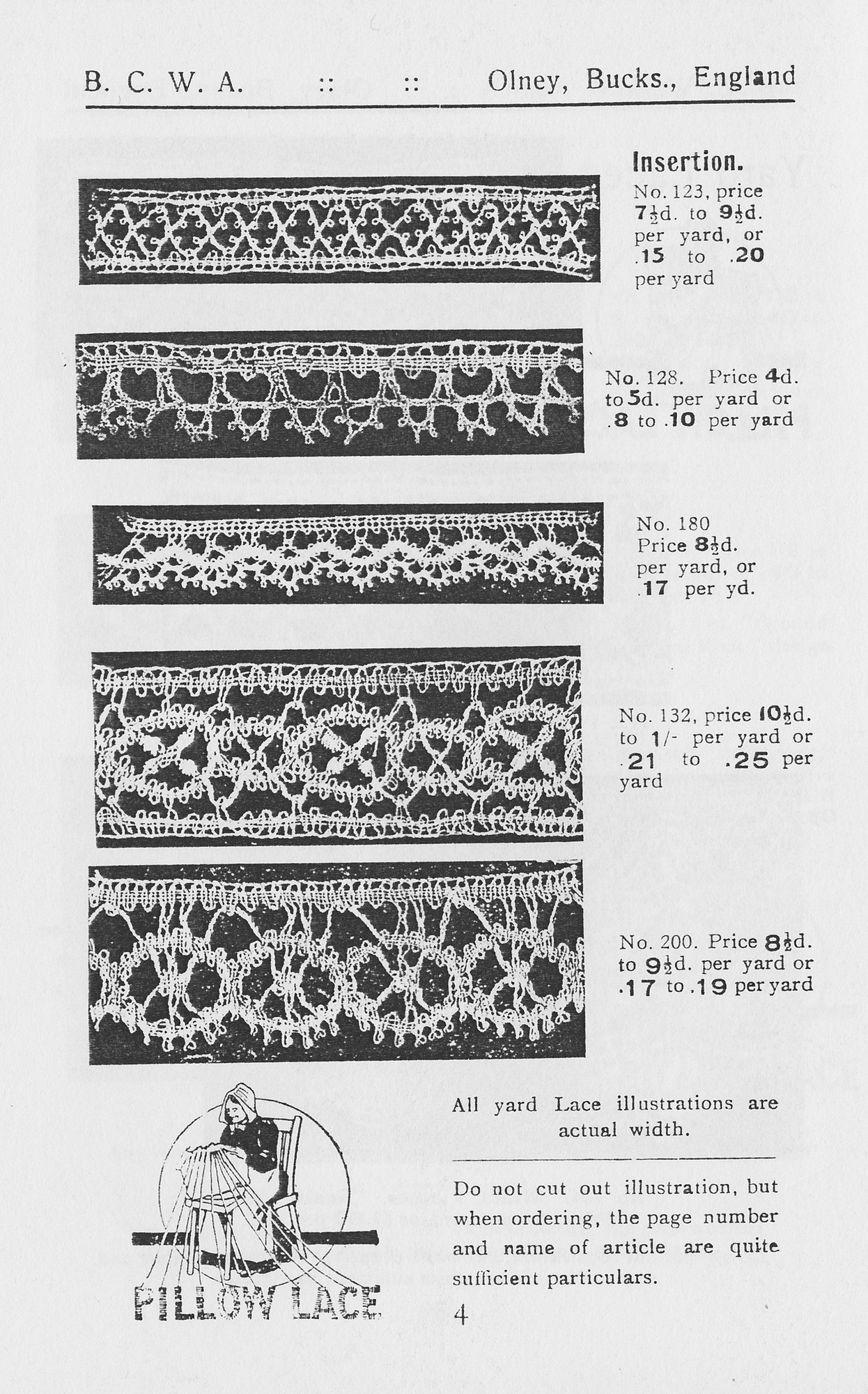 The finished lace was brought to the factory on Thursdays, being market day, and Harry would buy all of it and keep it in the stock room. For ‘special orders’, he would specify his needs. In the summer Cis used to cycle to Yardley Hastings with her tape measure and buy lace at the door. She had six ladies to visit who made lace including one whose work was particulaly beautiful. Cis would often return two weeks later for more and these ladies were always pleased to see her.