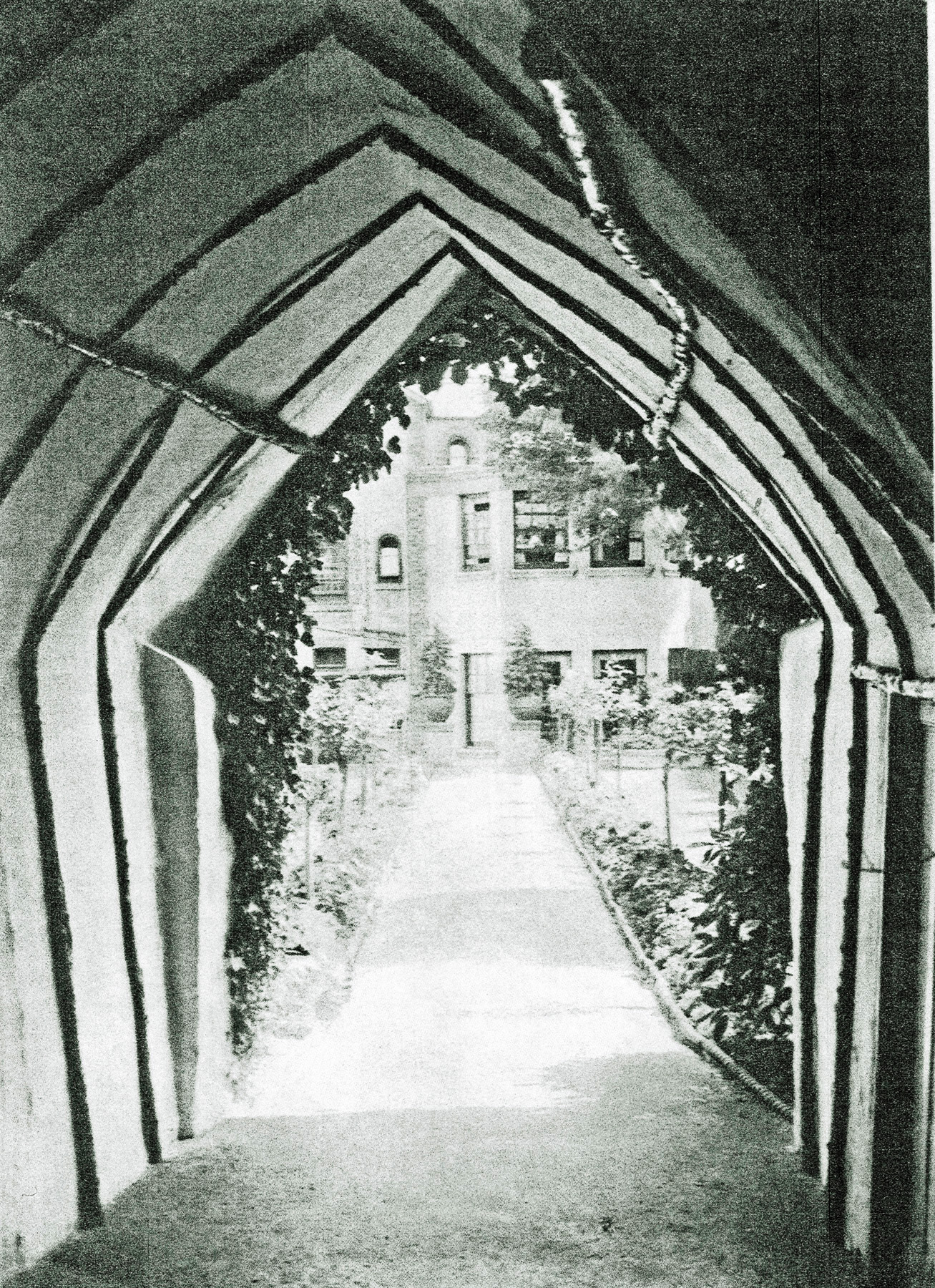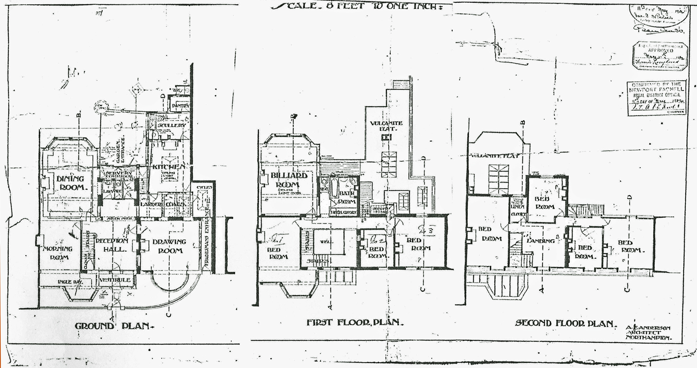 It is not clear when J W Mann purchased Nos. 67 and 69 High Street. Early Ordnance Survey maps show that they were two properties in 1882 but were already one by 1900, although very different in plan to the present. In the late nineteenth century the plan of the house extended back some way to the rear. These were presumably extensions to the original building, wiped away by A E Anderson’s designs of 1904 which consisted of new extensions to the front and back, and a complete remodelling of the interior. His extensions at the back are identified by red brick dressings to quoins and window surrounds; his striking additions to the front include the porch, the full height canted bay, the bow window and the cast iron railings. The garden of the new house took in all the land to the rear up to the boundary with West Street, and was later landscaped by Perkin’s Nurseries in Northampton. The conservatory was built by a local firm, W S Revitt, but the stone thatched cottage, used as an eye-catching feature, was already there in its present plan form in 1882.’