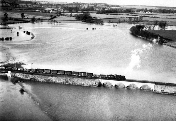 Train crossing the River Ouse bridge and viaduct during floods in February 1951.