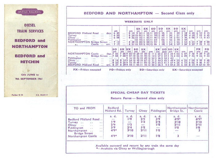 The passenger trains continued to operate throughout the 1940’s and 1950’s, but with motoring becoming more affordable, their use declined considerably. The passenger services and fares for 1961 are shown in the tables (sorry, could not produce tables for the 1930s, 40’s or 50’s!). The journey from Olney to Northampton took 19 minutes and cost 2/11d return, about 14½ p, pretty good value even in 1961.