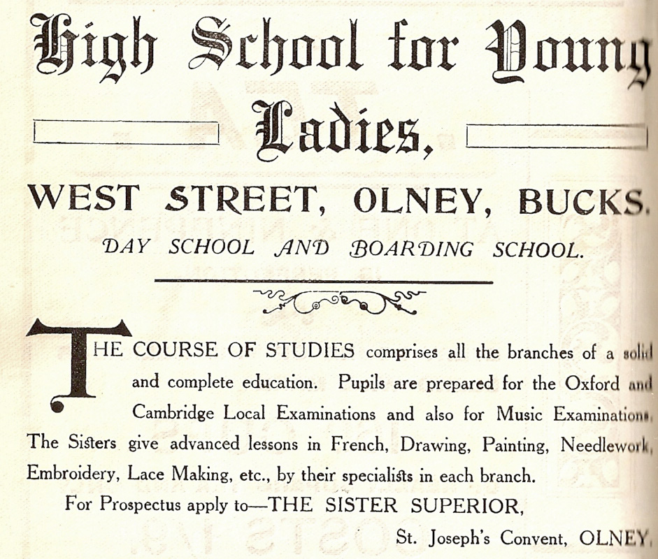An item advertising a High School for Young Ladies, West Street, Olney appeared in Oliver Ratcliffexs book of 1907. This advertisement stated that: ‘The course of studies comprises all the branches of a solid and complete education’, and: ‘The Sisters give advanced lessons in French, Drawing, Painting, Needlework, Embroidery, Lace-making etc by their specialists in each branch’. Pupils were prepared for the Oxford and Cambridge Local Examinations and also Music Examinations.