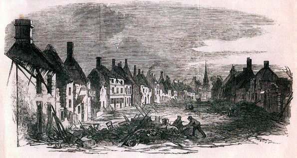 Many persons, it appears, considering their houses in danger removed their goods and clothes to places supposed to be safe, at a distance from the flames; but, in several instances they were destroyed before the owners had the slightest idea that they were in danger a second time; and in many places where ladders had been set against houses for the removal of goods, those upon them had scarcely time to get down before they were consumed; and every scrap of wood, even the wood covering of wells, are charred by the intense heat of the flames. The ruins are calcined; and the walls, being built of limestone, are in many cases reduced to lime. The number of houses destroyed is 55, and 25 others damaged – altogether, 80.
