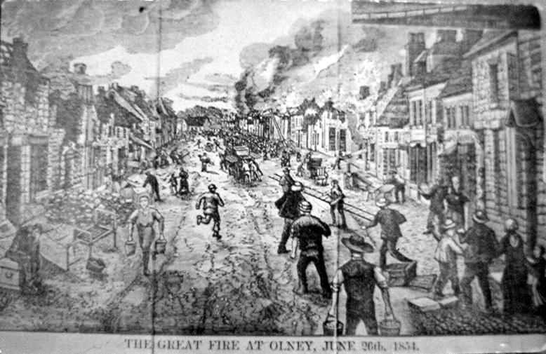 On Monday 26th June 1854 Olney suffered a calamitous fire. The fire is believed to have started on the western side of the High Street, to the south of what now is the Olney Centre. The fire was so noteworthy that it was reported in full in The Illustrated London News on 8th July 1854.