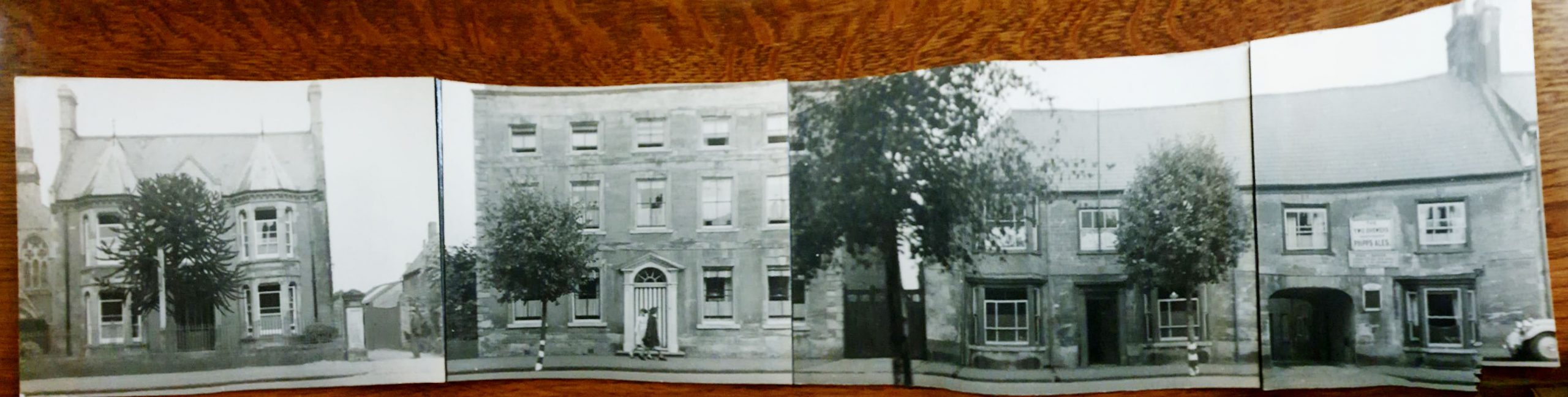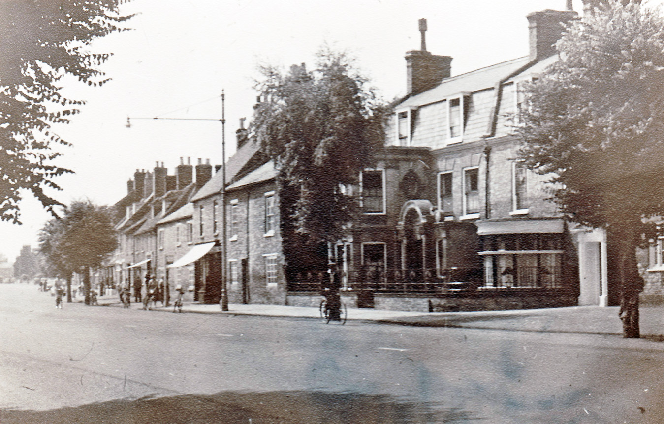 .The next image is a manually assembled composite view of four adjacent buildings photographed in the late 1940s. That is: from left to right, the Working Mens Club (now the Carlton House Club), Clifton House, the Olney Mechanics Institute and the Two Brewers Inn. Clifton House, the next Point of Interest on this trail, was demolished in the late 1950s.
