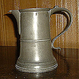 A pewter quart-sized measuring jug owned by John Lord. The inscription under the spout reads ‘J Lord Boot Oulney Bucks 1805’