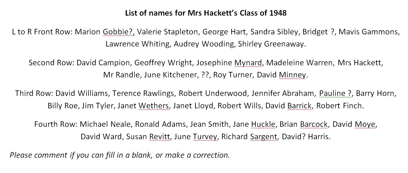 The senior class at the Primary School during during 1948, with Class Teacher Mrs Hackett and 43 children, is shown below. The Headmaster was Mr Freddie Randall who followed a Mr Packman.