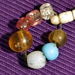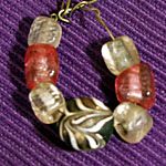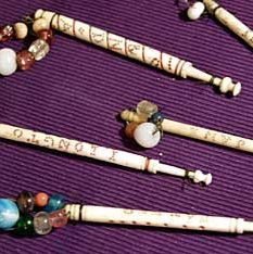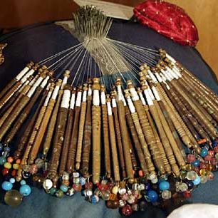 In this area the bobbins were quite different from those of any other lace making area: in other areas the bobbins had a bulbous shaped shank to give weight and keep the thread taut. Here they had slim shanks and were weighted by a spangle of glass beads. In general, bobbins were made from various types of hard or fruit wood, but in this area bone was also used.
